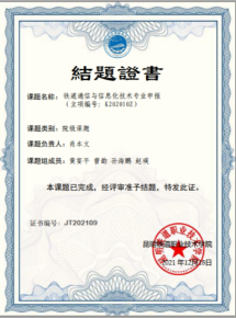 姓名:曾韵 时间:2021年12月,主持(参与)完成校级《铁道通信与信息化技术专业建设》课题。