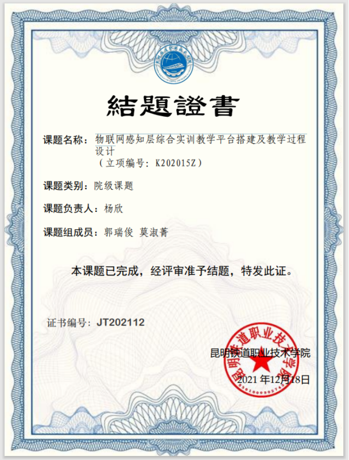 姓名:郭瑞俊 时间:2021年1月,参与完成2021级《物联网感知层综合实训教学平台搭建及教学过程设计》课题。
