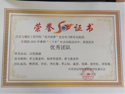 指导学生参加2022年暑期“三下乡”社会实践活动获得优秀团队奖