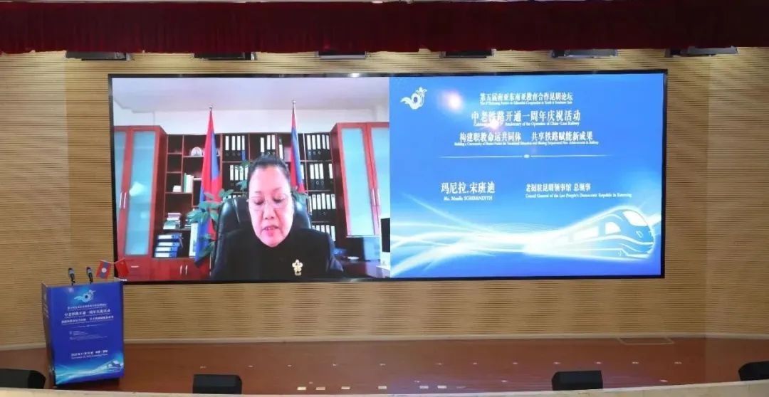中方老方相关政府部门、企业、高校代表、专家学者围绕中老铁路在教育、商务、文化方面交流合作所取得的贡献及成就,以及未来铁路国际化专业技术技能人才需求及校企合作等问题开展交流研讨。老中合作委员会办公厅副主任康鹏线上致辞,老中铁路公司总经理袁明豪、云南省建设投资控股集团有限公司副总经理杨国文、中国铁建高新装备股份有限公司海外经营部总经理董志、联合国国际劳工组织—中国南南合作和三方合作项目经理兼协调员刘宇彤作主题发言,老挝铁道职业技术学院教师代表李灵美现场作交流发言。