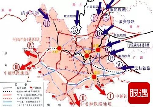 云南省按照“立足周边,拓展东盟,开拓南亚,深化合作,面向世界”的思路,以综合交通通道建设为展开空间,全力构筑我国与东南亚、南亚以及印度洋沿岸国家互联互通的国际通道与枢纽。根据国家《中长期铁路网规划》,云南铁路网的规划及建设,将进一步推进和完成“以昆明枢纽为中心,八入滇(滇藏、成昆、内昆、贵昆、南昆、云桂、渝新葡萄路和沪新葡萄路客运专线)、四出境(中越、中老、中缅、中缅印铁路)”的云南铁路网建设目标,打通云南路网通道卡脖子和断头路段,进一步补充、完善、扩大路网规模。云南将建设成为面向南亚、东南亚的辐射中心,形成一个以云南为门户、周边为基础、大湄公河次区域合作和孟中印缅经济走廊建设为重点的多层次宽领域区域性国际合作新格局。以昆明为枢纽的云南铁路网建设项目和规模将迅速增多和扩大。